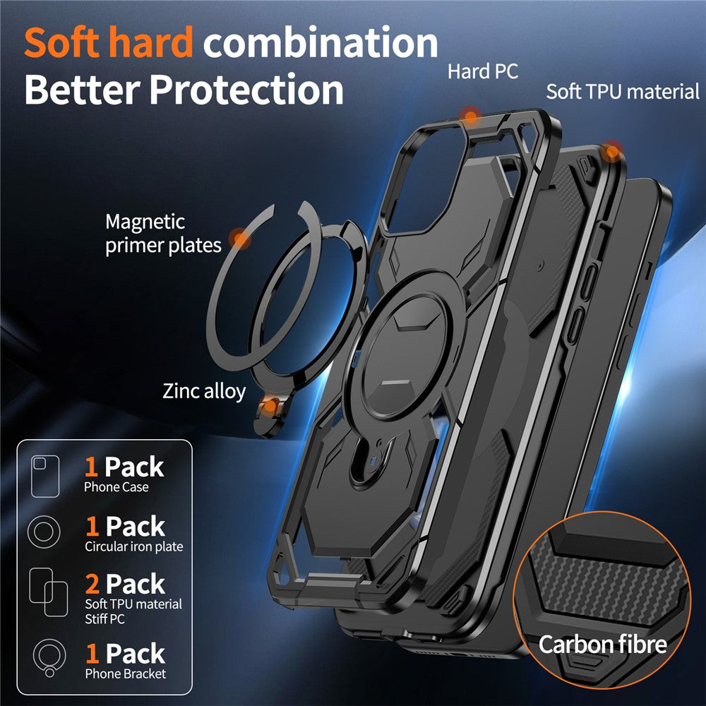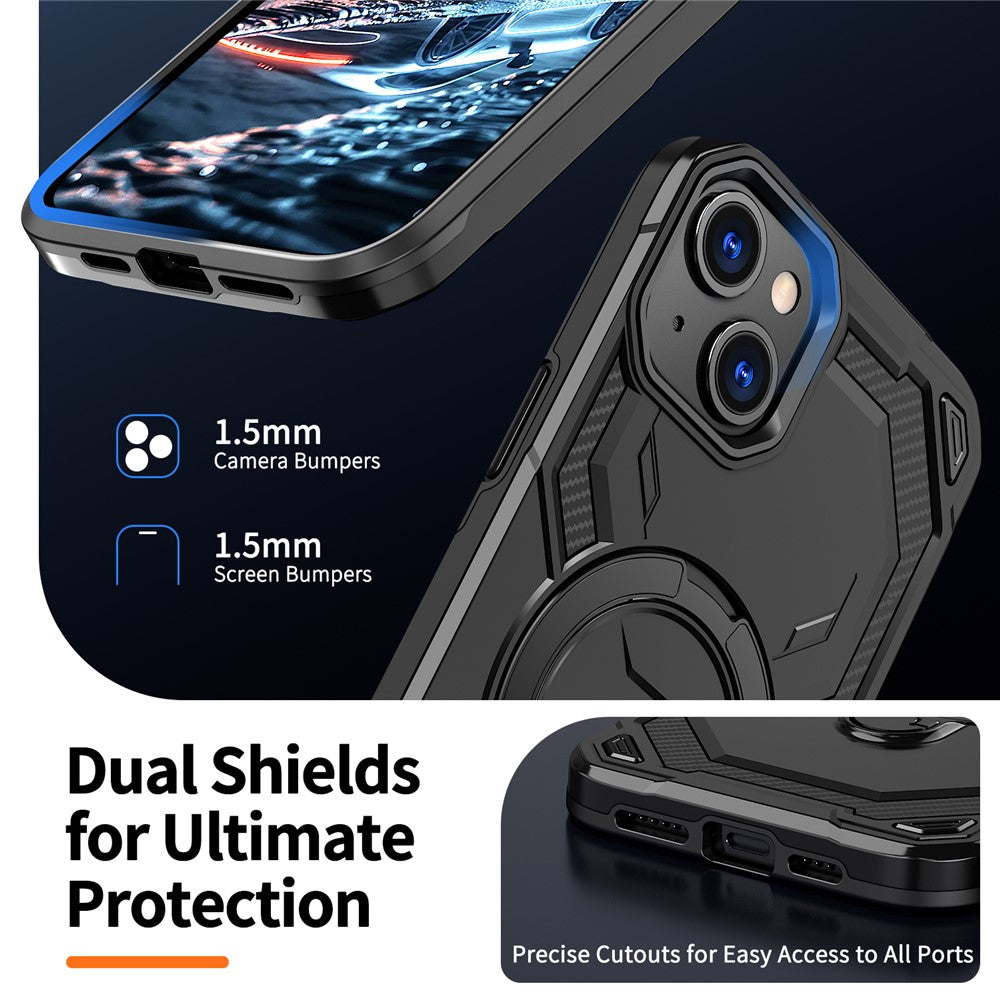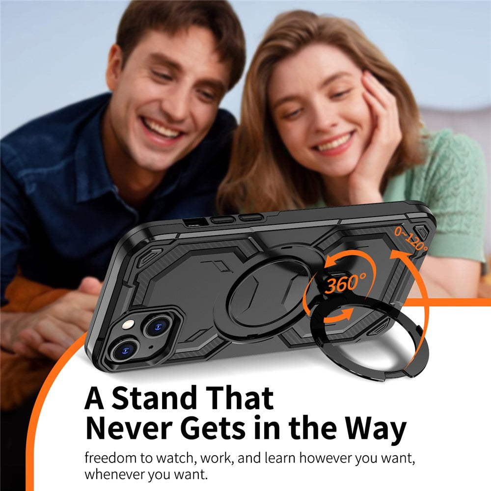 For iPhone 15 Magnetic Case Ring Kickstand PC + TPU Hybrid Phone Cover