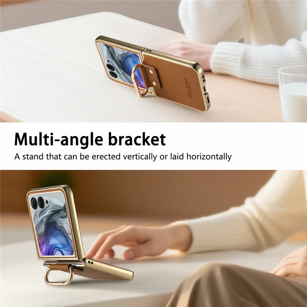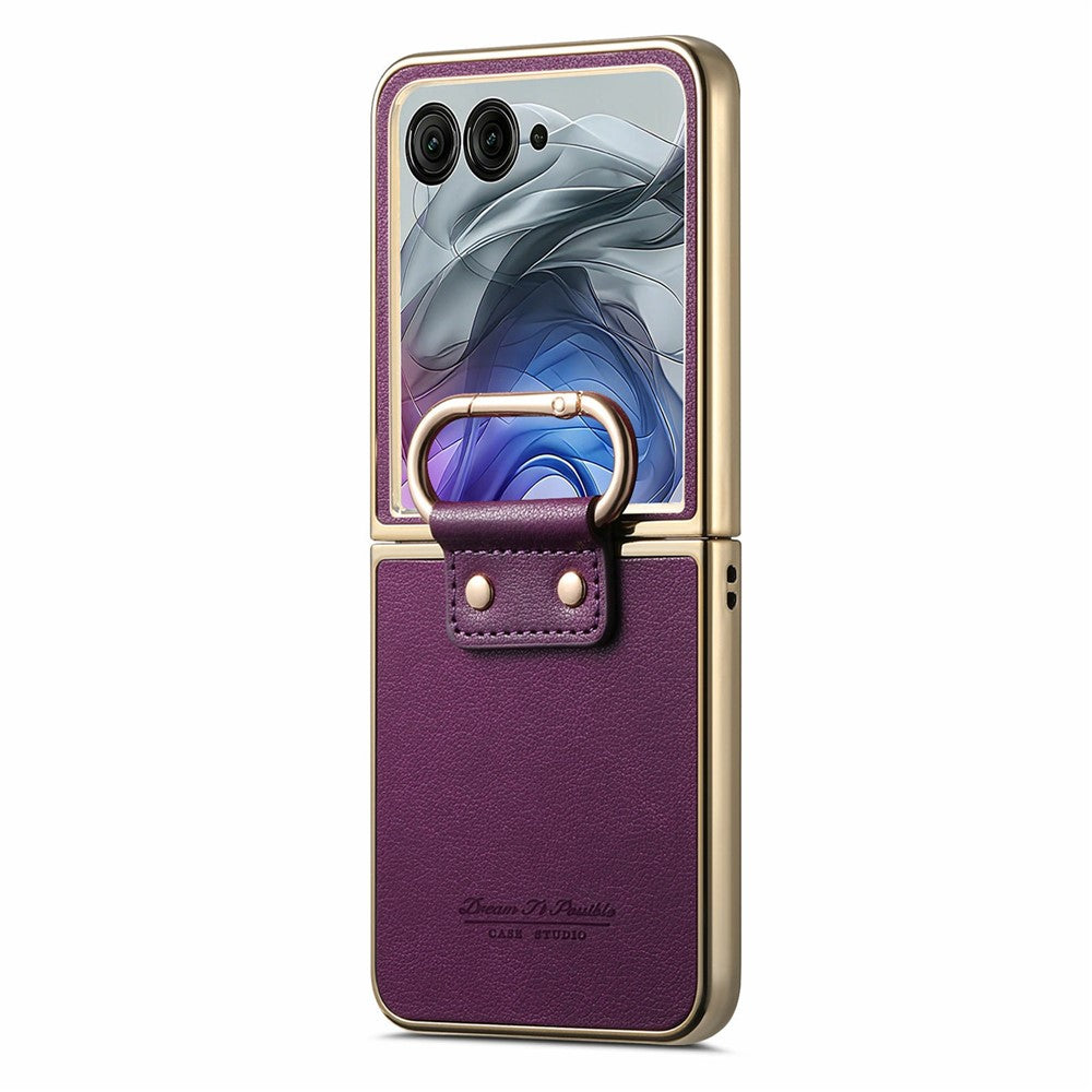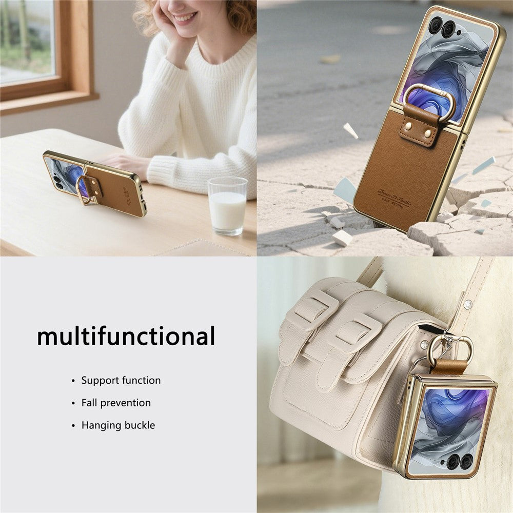 For Motorola Razr 50 Ultra 5G Case Electroplating Leather Coated PC Phone Cover with Spring Ring Buckle Kickstand