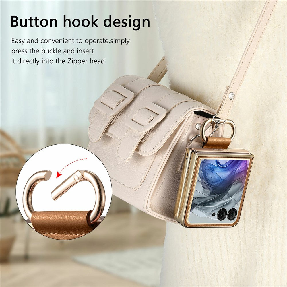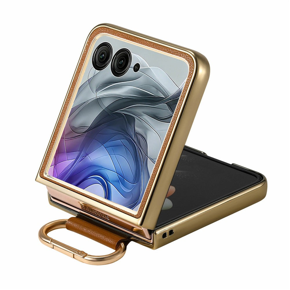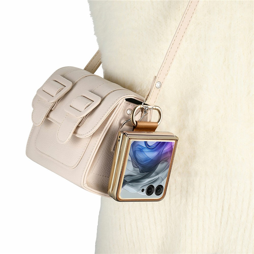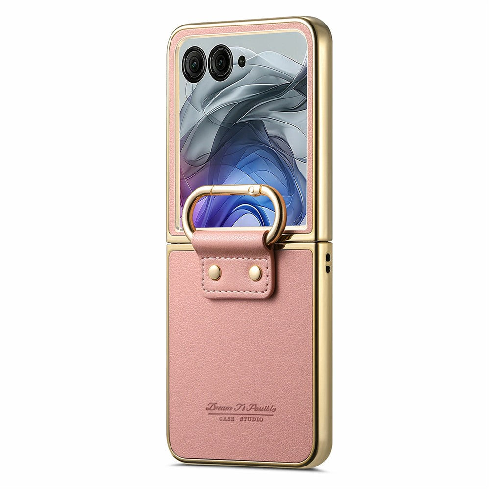 For Motorola Razr 50 Ultra 5G Case Electroplating Leather Coated PC Phone Cover with Spring Ring Buckle Kickstand