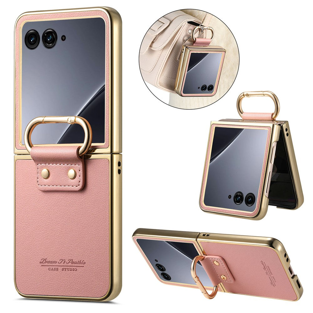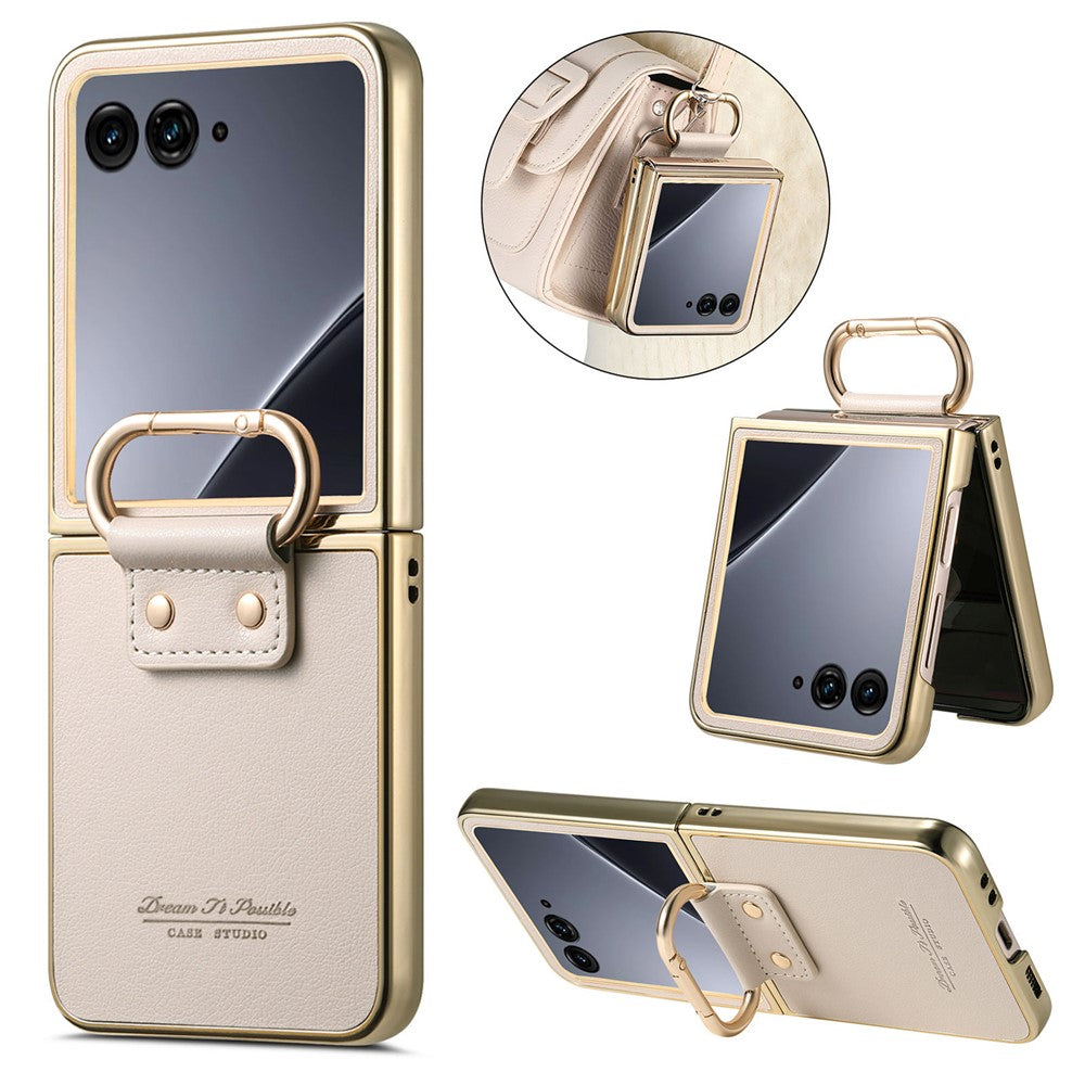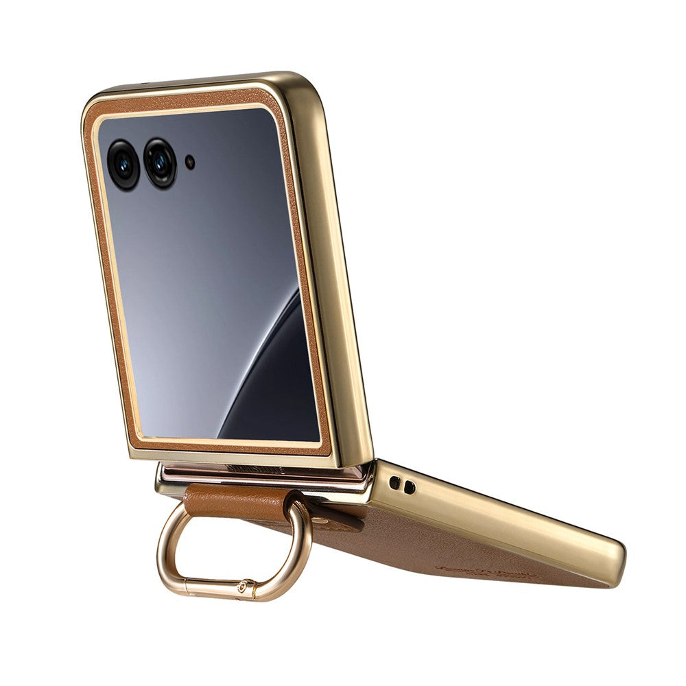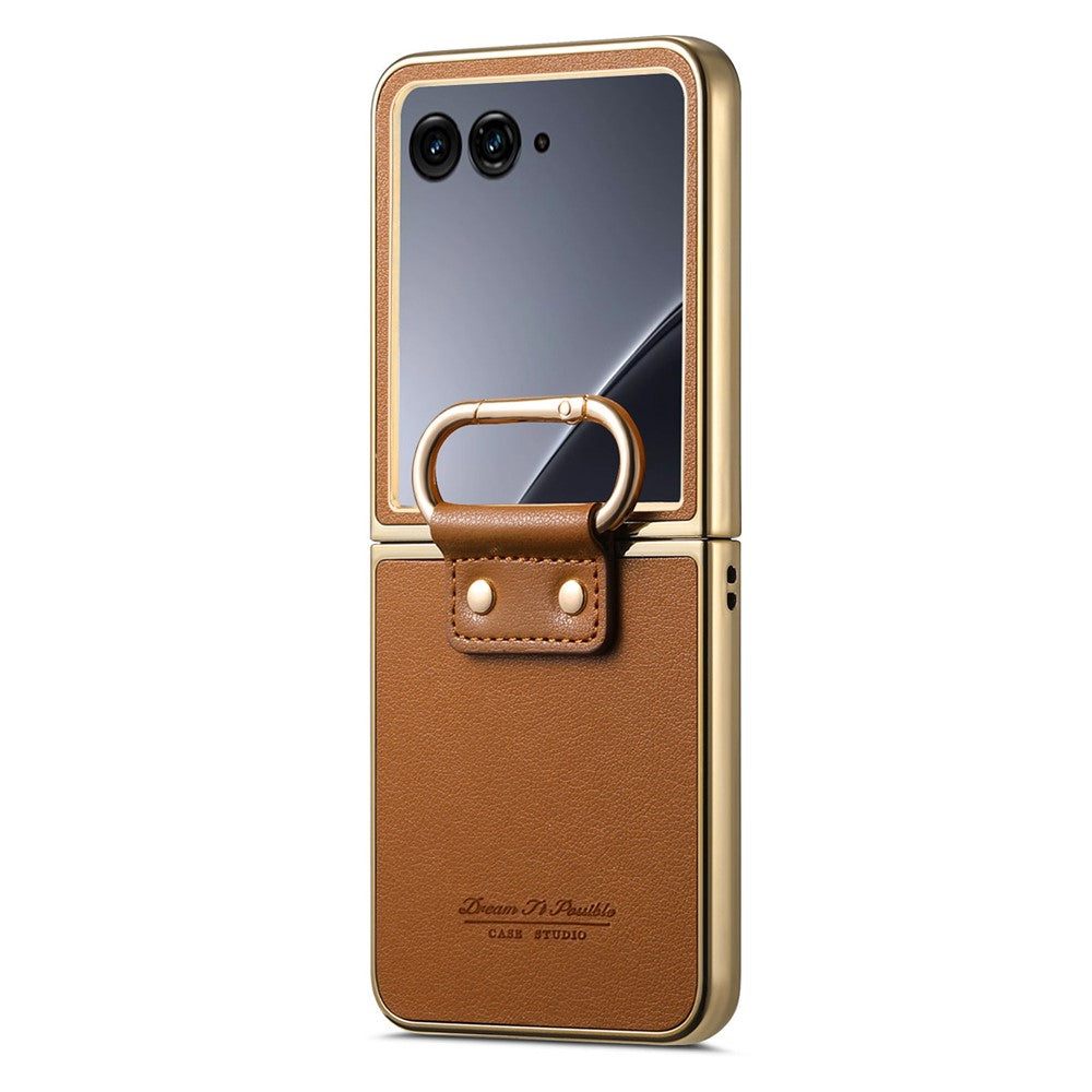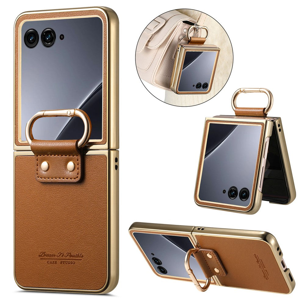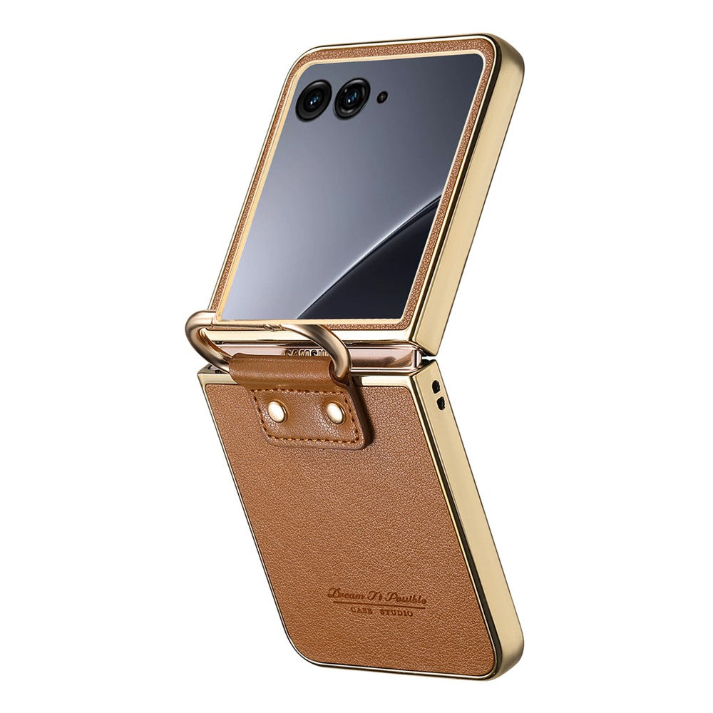 For Motorola Razr 60 Ultra 5G Case Electroplating Leather Coated PC Phone Cover with Spring Ring Buckle Kickstand