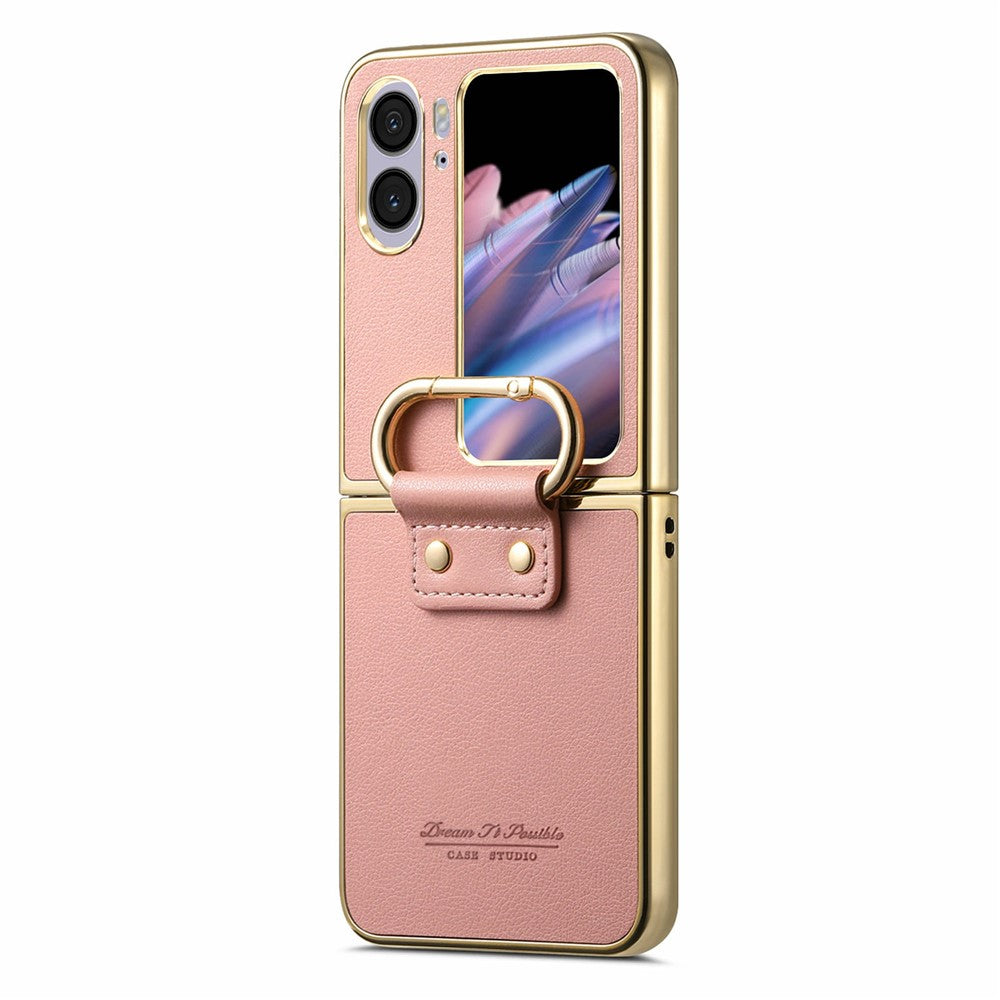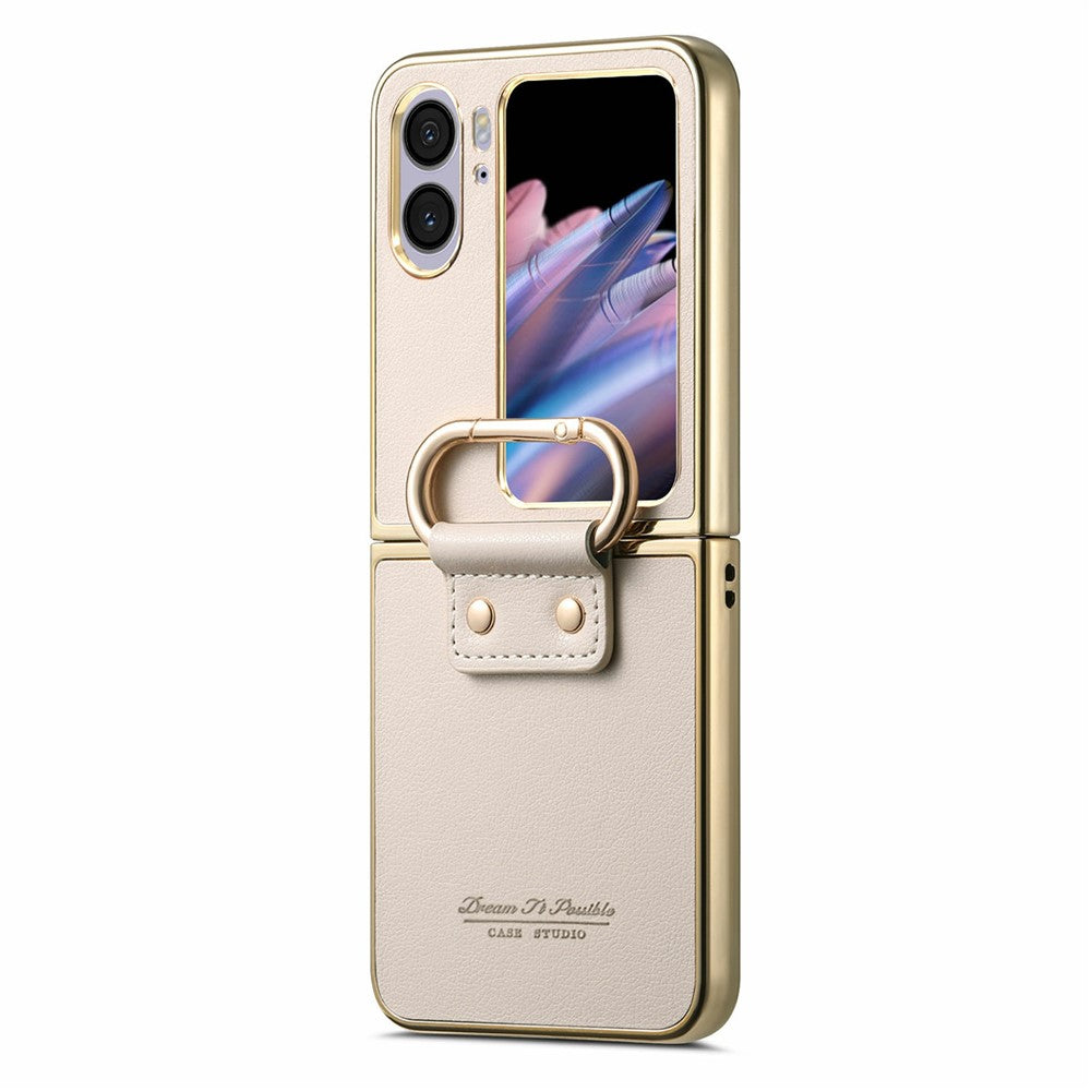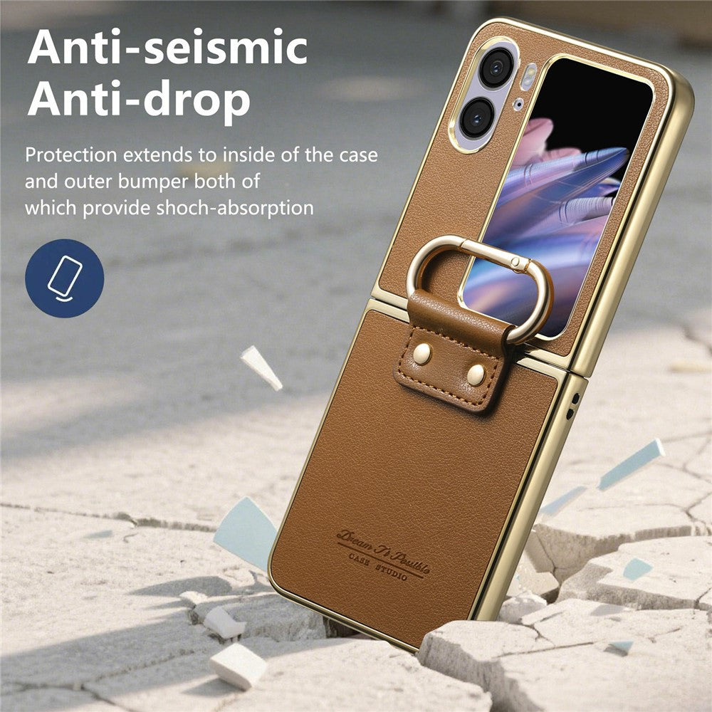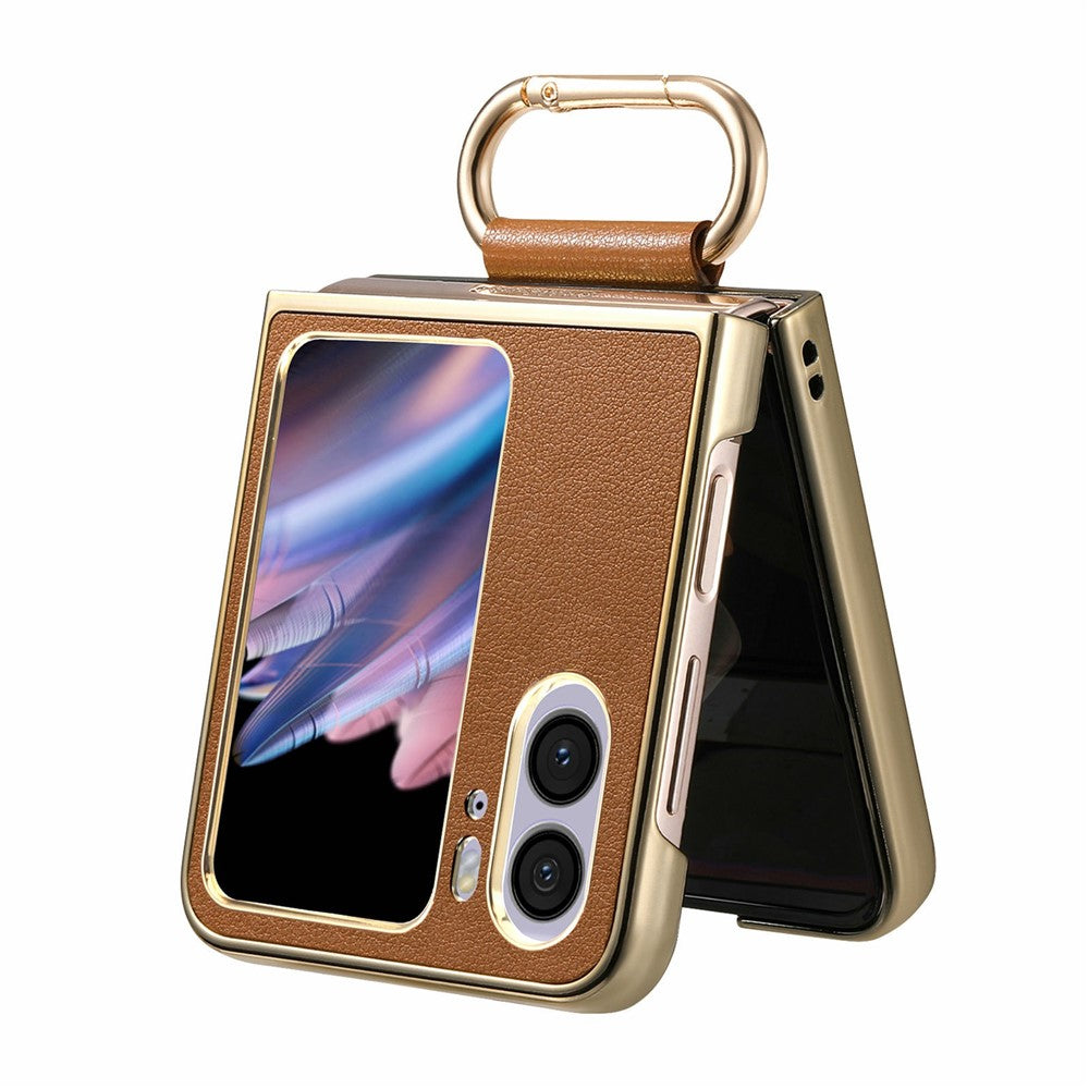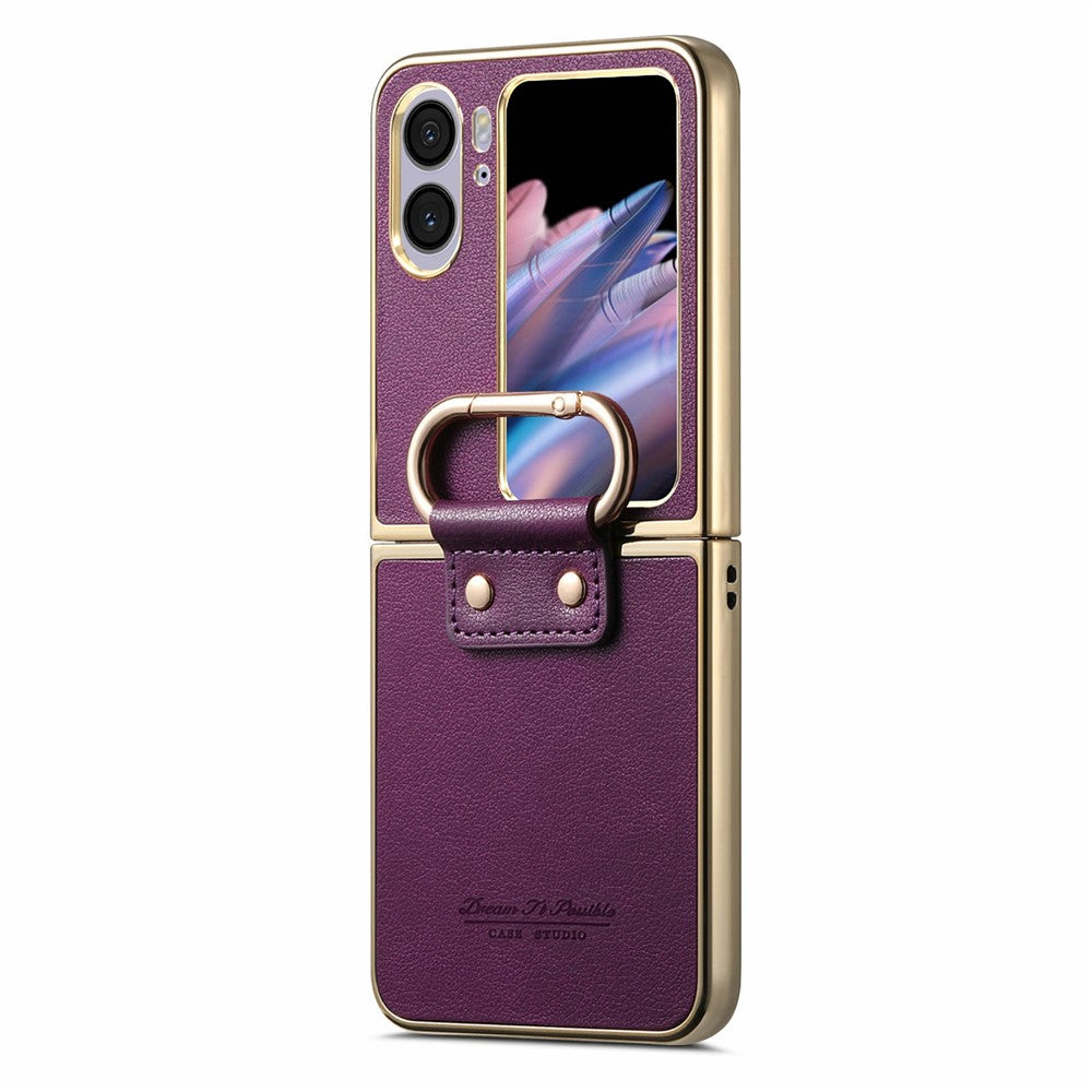 For Oppo Find N2 Flip 5G Case Electroplating Leather Coated PC Phone Cover with Spring Ring Buckle Kickstand